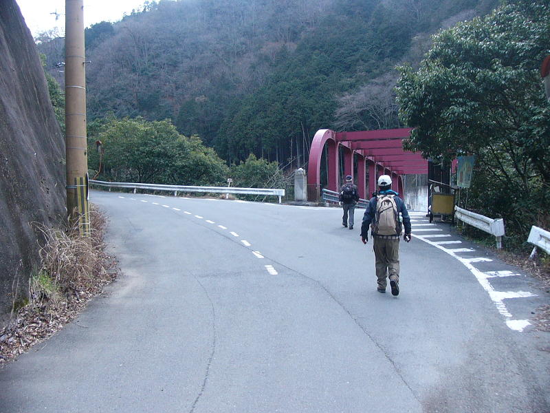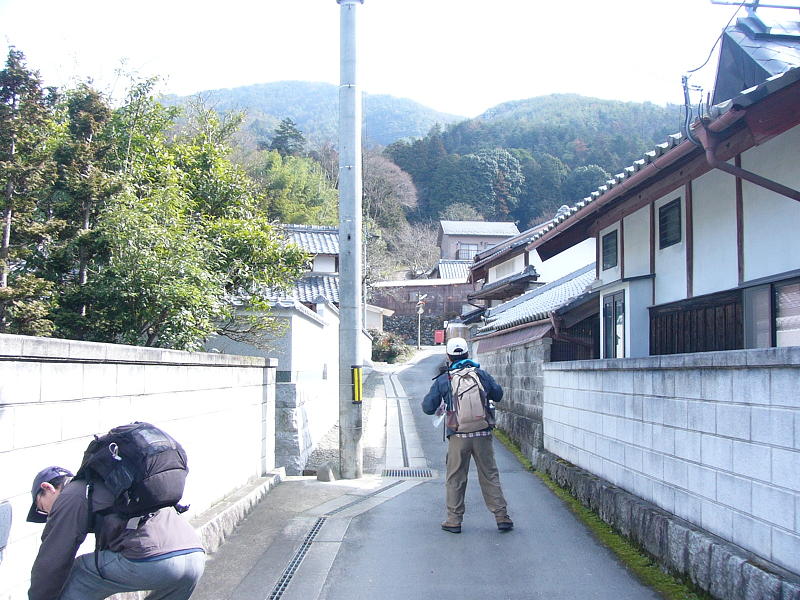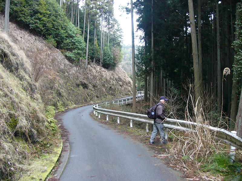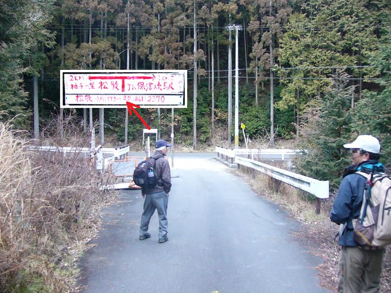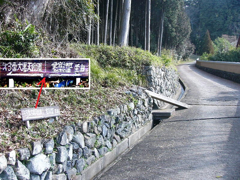 車の通っていない林道を10分近く歩くと、水尾川を跨いで府道50号(京都日吉美山線)に突き当たるので手作りの道標に従ってここを右折する ※この道は嵐山から水尾を通って“京のソバ処”越畑とを結び、古い歴史を持ちながら今でも重要な幹線道路になっている |