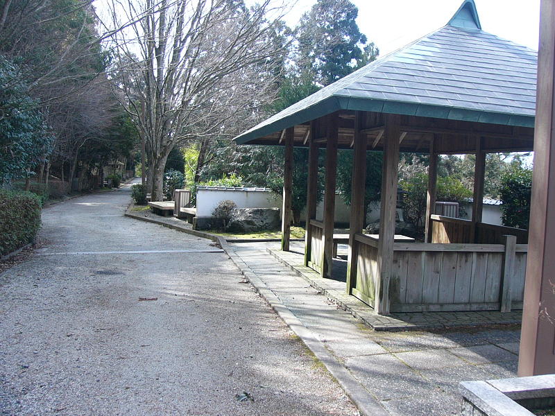 すぐ案内書等で見覚えのある休憩施設が建つ和らぎの道に飛び出す 正面のこんもりとした森で最初のポイントとなる愛宕神社の静かな佇まいが目にやっと飛び込んでくる |