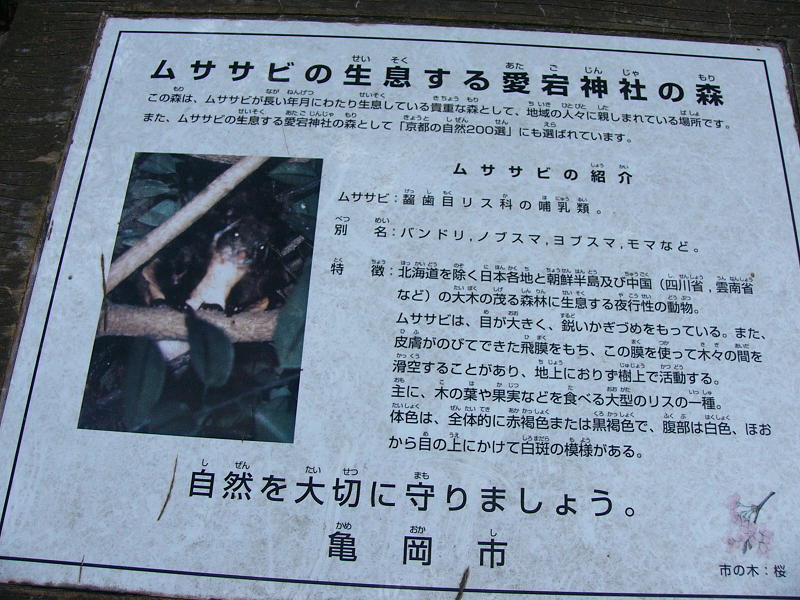 鬱蒼とした森から顔を覗かせる小さな鳥居の下を潜ると奥まった愛宕神社・本殿が清楚な佇まいで迎えてくれるので、同行の2人が養仙寺に立ち寄っている間に今日の山行の無事をソッとお願いする ※『丹波の神社』サイトによると、愛宕神社は継体天皇元年に神殿が建立され元愛宕とも呼ばれ、本殿は重要文化財に指定されている山城国鷹峯に当社の分霊が祀られたが、その後和気清麻呂の請願により嵯峨山(現愛宕山)山上に移したと書かれ、また道端の案内板には「境内には亀岡の名木に指定されてゐる巨木数本をはじめ、樹木が鬱蒼と茂った一体にはムササビが生息する」といった旨の説明がなされている |