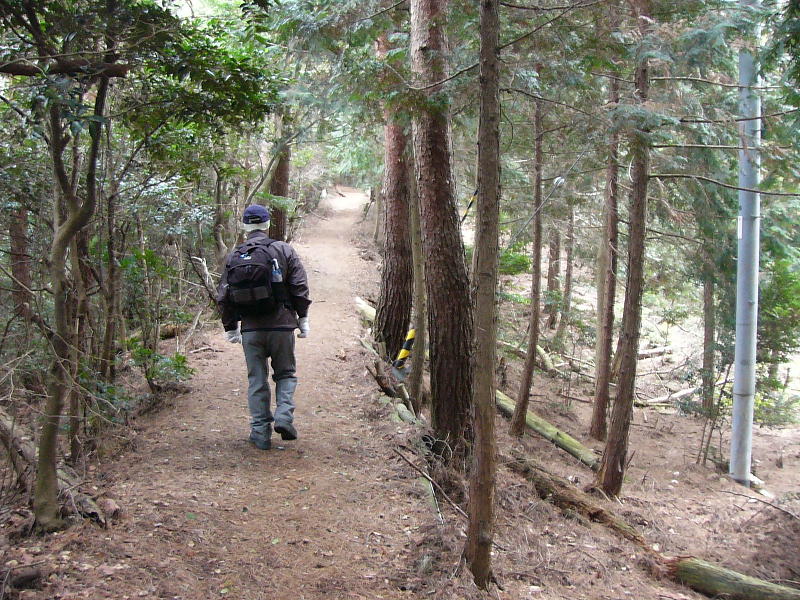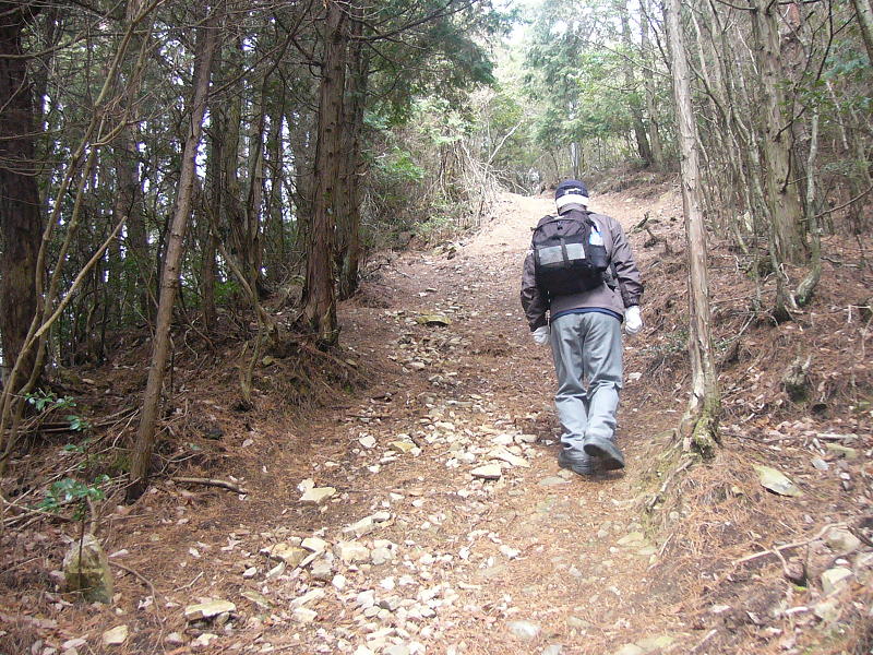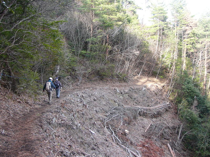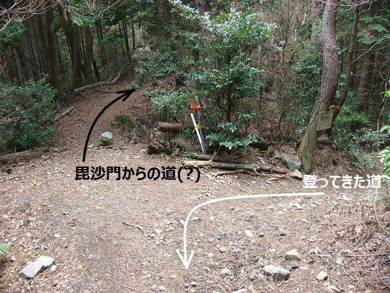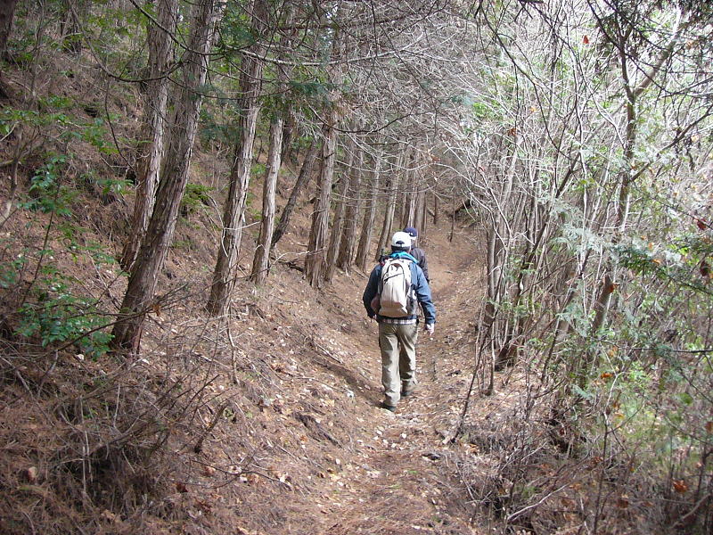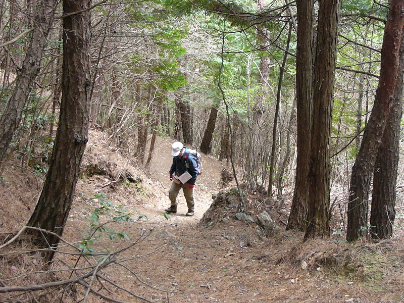 平坦な尾根道に足を進めると右後方の谷筋から少し荒れた道が合流してくる 地図には勿論記載されていないが目で追いかけてみると保津ヶ丘公園辺りから登ってきている踏み跡のようだ |