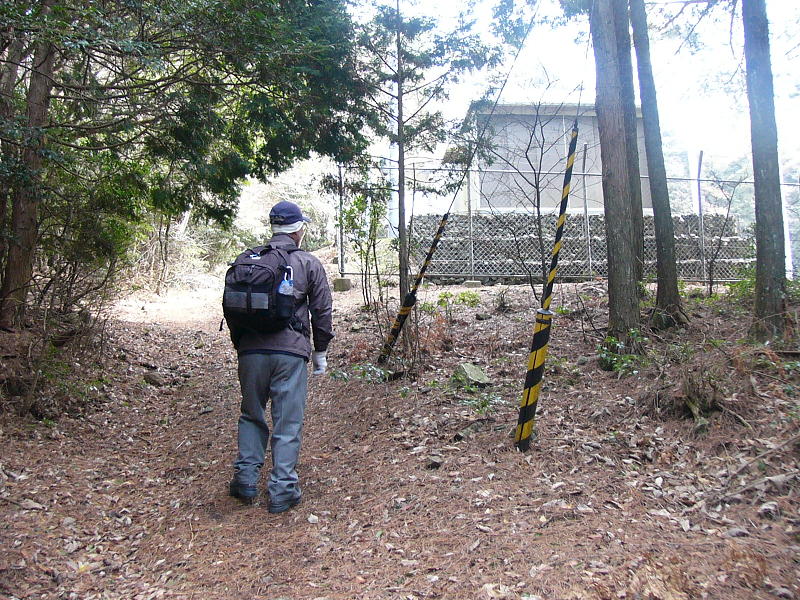 相変わらず樹林に覆われた山道なので展望は利かないが、木の間越しにウッスラと望める亀岡の市街地を振り返りながら急坂を登ると鉄パイプで組まれた簡易なゲートに到着する はたしてどういった目的で付けられたゲートなのか判らないが・・・・ |