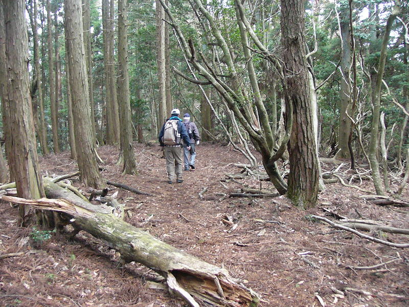 ほぼ水平な中腹道を辿ると明智越の最高地点(420m)から南に伸びる尾根の鞍部を乗越する ここからは緩やかな下り道に変わるが、すぐ右手方向に地図にも記載されている尾根伝いで保津峡へ抜ける“点線の道”を見やる |