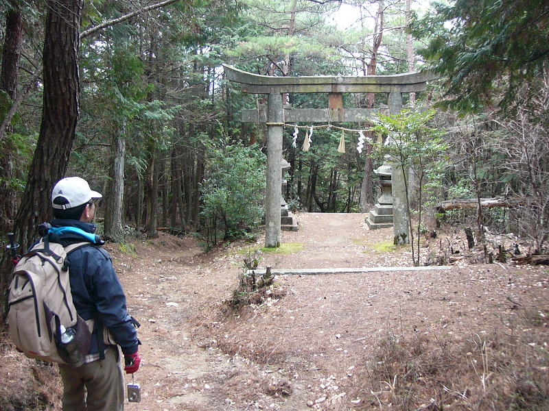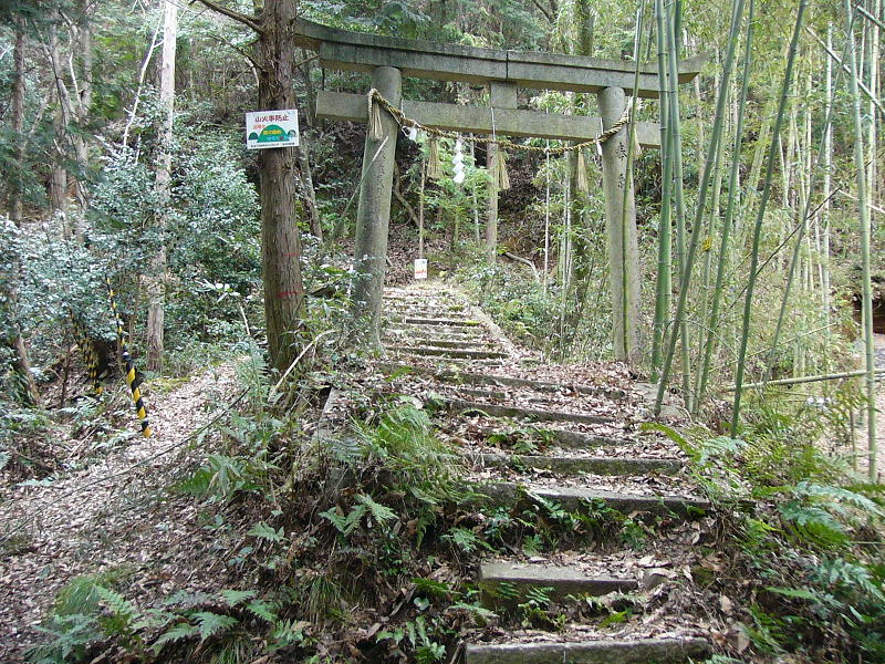 続いて前方に鳥居が見えてくると道の崩落した所を通過するので足元に気を付けてやり過ごする 相変わらず次の丁石の姿を見ることが出来ないが「この辺りでそろそろ一丁石が現れても良い頃なのに・・・」と思いながら最後の鳥居を潜る |