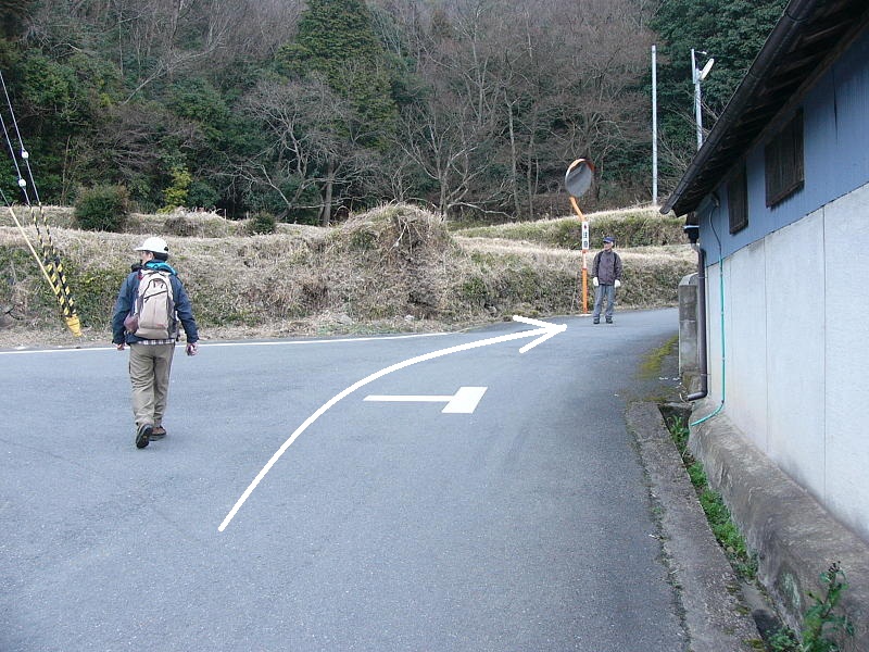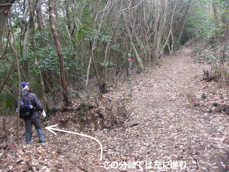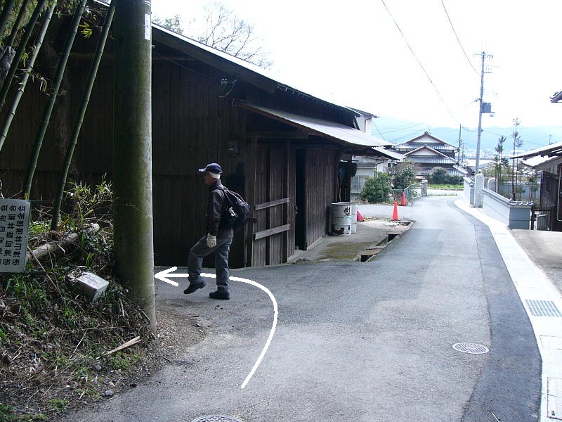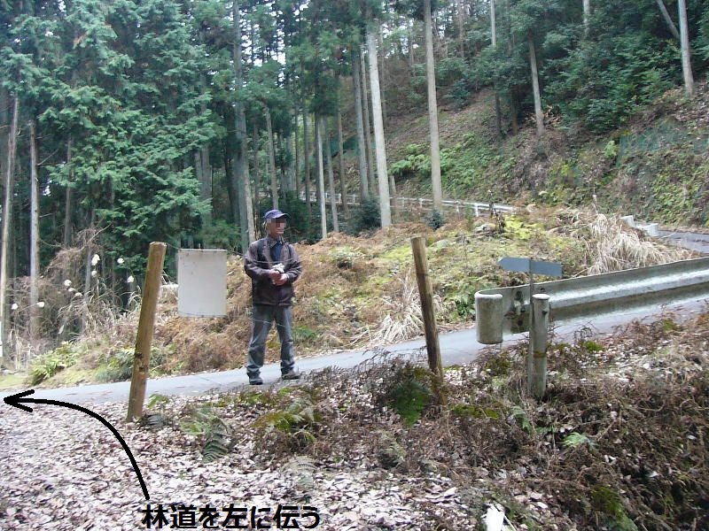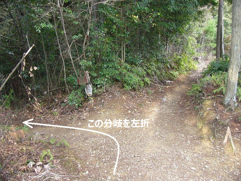 さらに50m程舗装道路を西に辿ると左手に続いた竹林が途切れるところで┤状の左に別れる道が現れるのでここを左(=南)へ辿る ※この分岐には道標はないので見落とした場合は少し遠回りすることになる |