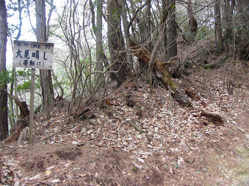 少し勾配が急になってくると簾戸口から10分で「この上 大見晴し(帯解け)」と書かれた標識が左手に現れる ※今では樹木が茂ってほとんど展望には恵まれないが、以前は素晴らしい眺望があったのかも知れない |