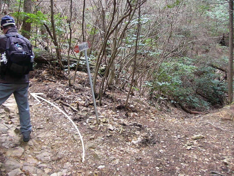 すぐ傍に┤字状の分岐があるので、足元に打たれた小さな道標に従って左へ進む ※後で判ったことだが、少し遠回りを覚悟して直進すればもう少し素晴らしい保津峡の景観を眺めながら歩けたようだ |