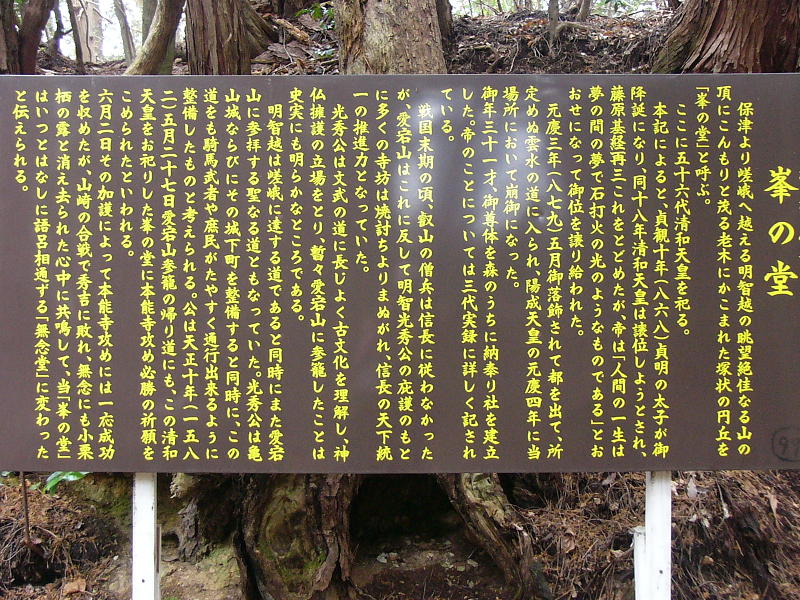 少し平坦な道になると「峯の堂(むねんどう)跡」に到着する どうやらこの案内板の裏の小さな円丘をこのように呼んだようだが、確かめた限りでは何の変哲もない小さな円丘でとても清和天皇の祀られた場所とは思えない |