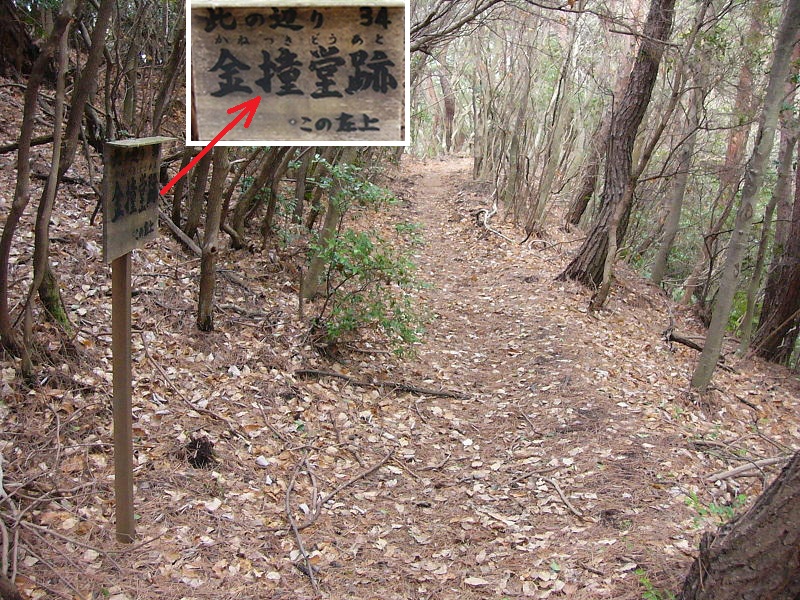 静かな坂道を緩やかに登ると数分で鐘撞堂跡に着く ここでも「此の辺り 鐘撞堂跡 この左上」と書かれた案内板がなければ全く見過ごしてしまいそうだが、念のため左上の尾根を確かめてみるが小さな台地があるだけで何も遺構を見いだすことは出来ないまま足を進める |