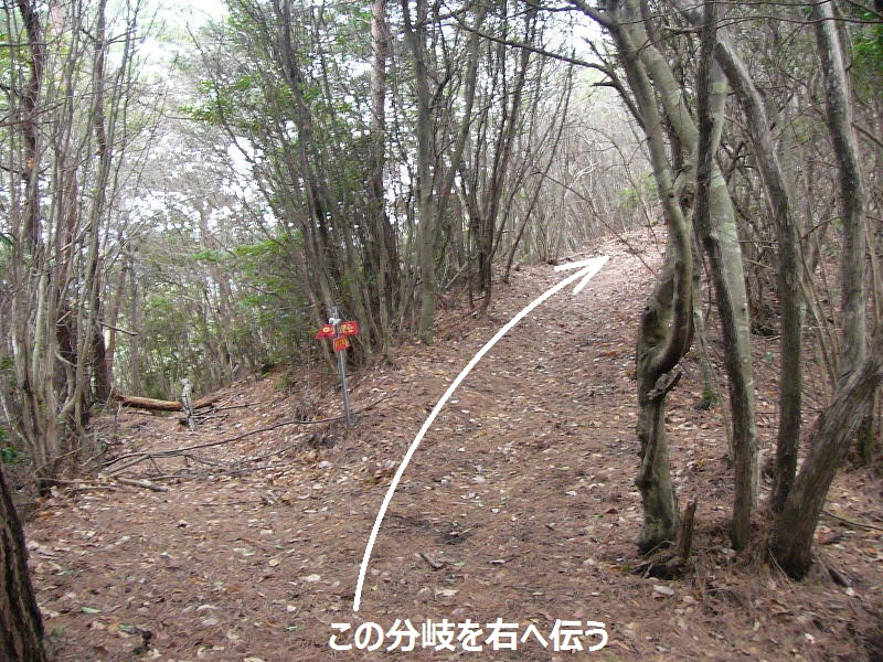 快適な尾根道を進むとY字状の分岐が現れる 道標はないが左への道には手折られた小枝が渡されているのでここは右へ緩やかに登る道を辿る |