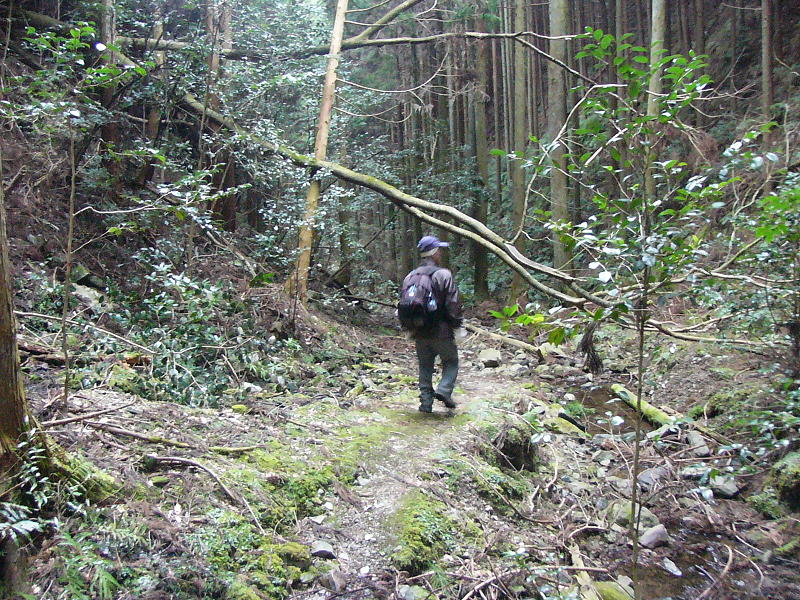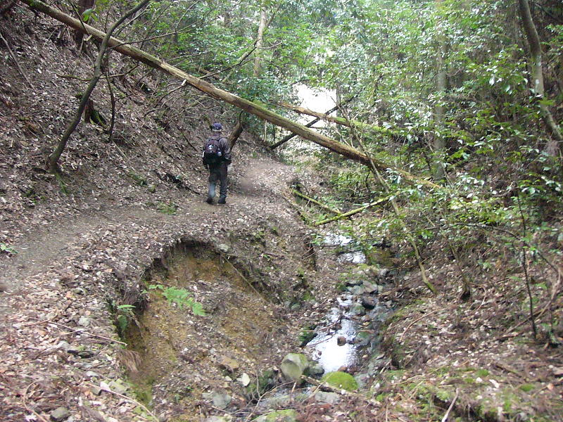 コースが一部崩落していたり荒れたところも多く見られるので足元への注意も怠ることが出来ない ほとんど水のない小沢の左岸に着けられた静かな山道を相変わらずノンビリと下る |