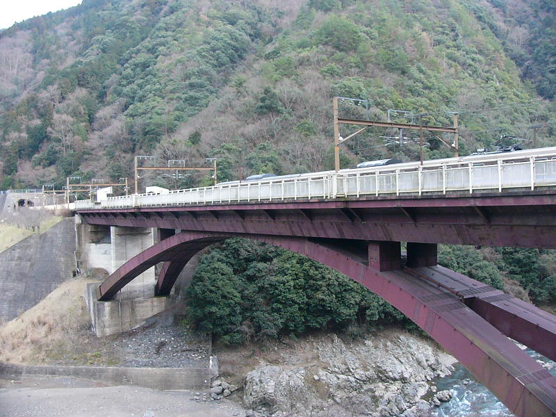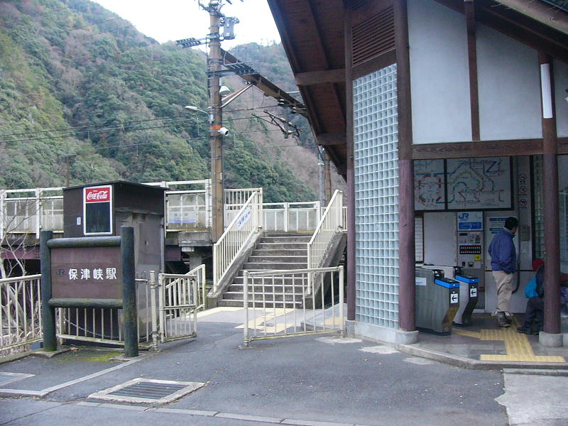 右手の山肌に沿って舗装路に足を進めると、曲がりくねった保津川を跨いで架けられた鉄橋が姿を現す この橋の上からは鉄橋の上に造られた無人のJR山陰線・保津峡駅が静かに迎えてくれる |