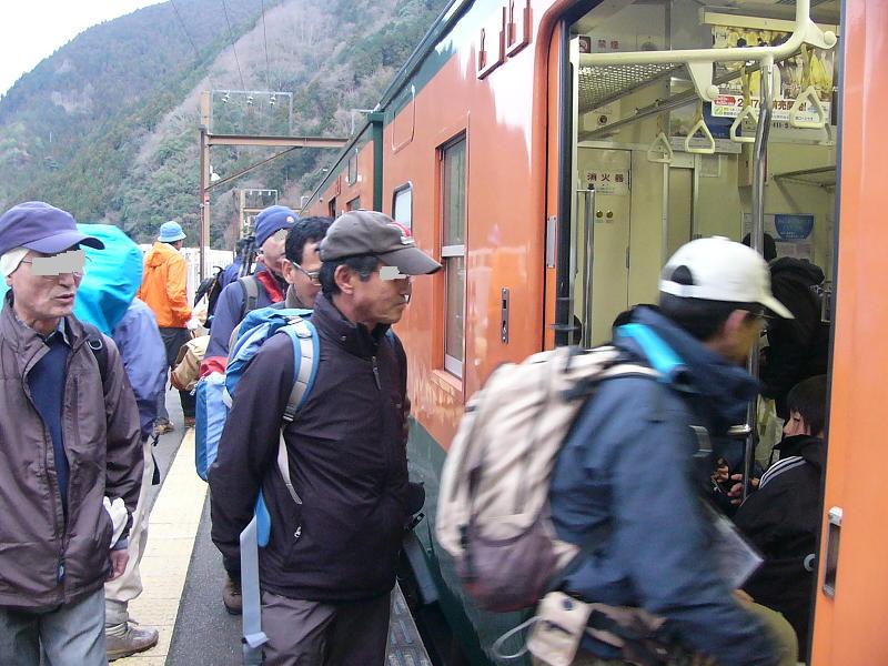 今日の山歩きのゴールに無事到着だが、駅前での眺望を楽しんでいる間もなく京都行きの列車がトンネルを抜けてホームに滑り込んでくる ※駅での待ち時間僅か5分という絶妙のタイミングで多くのハイカーに紛れて薄暗くなってきた山峡を後にする |